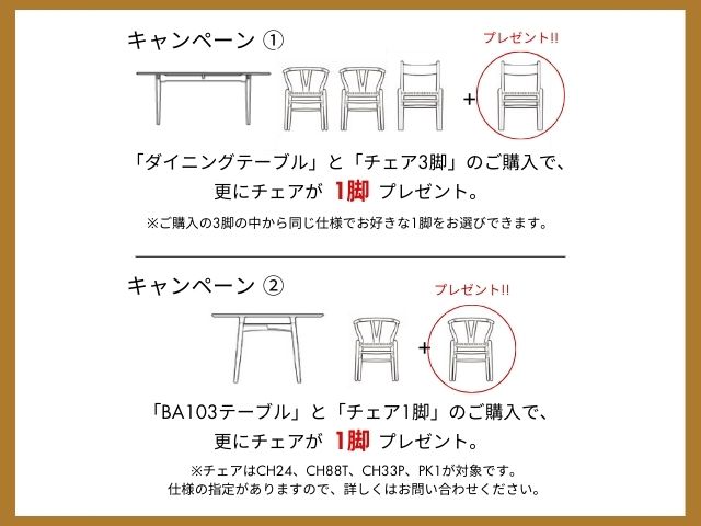 ダイニングテーブル「BA103」と、対象のチェアを一脚ご購入で、購入分と同じ仕様を1脚プレゼント!!