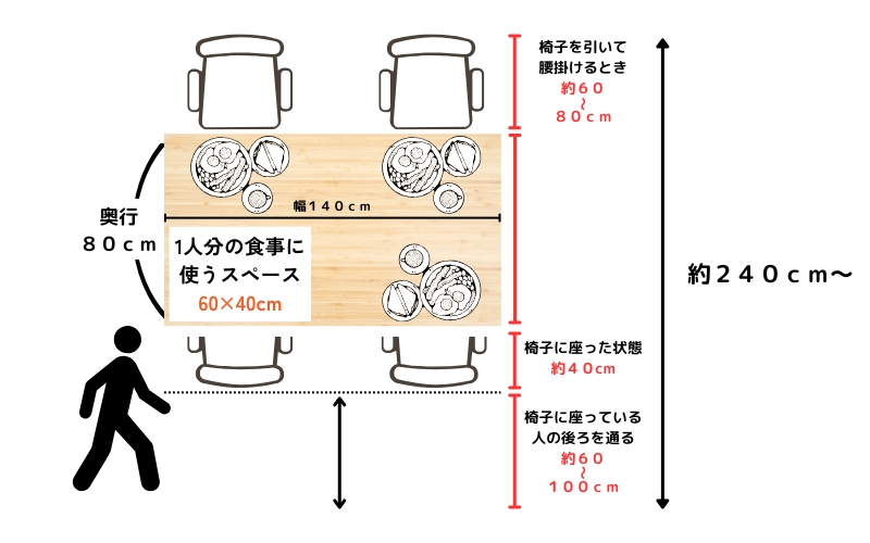 食事をするときの1人分のスペースが「幅60cm×奥行40cm」と言われています。隣り合う人との距離を考えると幅も奥行もあと10cmくらいずつあると理想的だと思います。