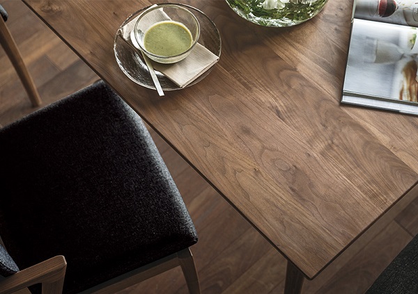 脚に特徴があり、同シリーズの椅子やベンチと並ぶ姿は芸術作品のようです。Kotiテーブルでは節の少ない部分を厳選した、最上グレードのものを使用した「プレミアム」と「ノーマル」から選ぶことができる。サイズ展開も非常に多く、最大幅2400㎜/奥行1000㎜まで選択可能。