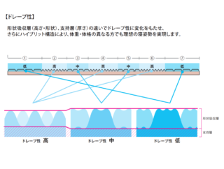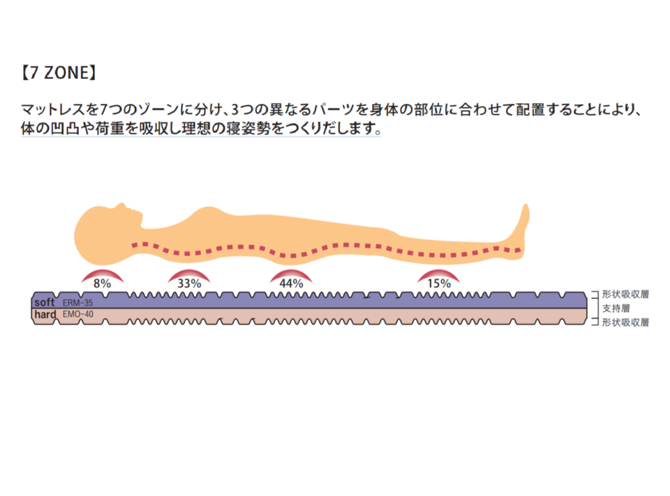 特殊な加工技術でマットレスを 7つのゾーン に分割し、3つの異なるパーツを身体の部位に合わせて配置することにより、体の凹凸や荷重を吸収し理想の寝姿勢を作り出します。