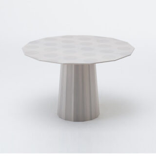 特徴的な14角形の天板は、2~4人で囲むのにちょうど良いサイズで、座った時に脚部に膝が当たりにくいように計算されています。木地に黒い線を描いた「グリッド」、淡いグレーに印象的な水玉柄の「ドット」、木地にほんのり白く着色した「ナチュラル」の3種類を展開。