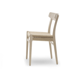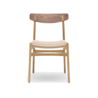 1950年、当時はまだ新進デザイナーだったハンス・J・ウェグナーが、初めてカール&ハンセン社のためにデザインしたシリーズの一つ。オーガニックなフォルムで、テーブルを有効に使うことができます。特徴的なペーパーコードの座面、安定感をもたらす後ろ脚の曲線、背に施された十字型の埋木、随所にウェグナーらしい要素が織り込まれていて、発表当時より復刻版の方が人気を集めているそうです。