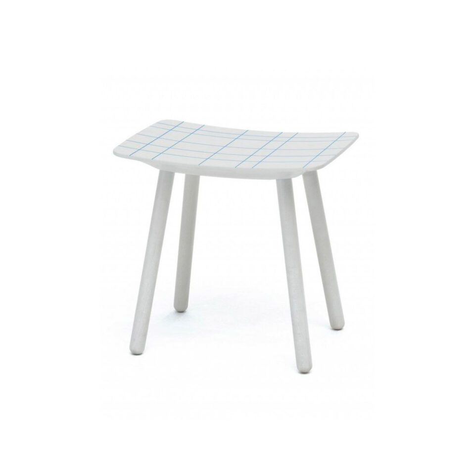 座面の裏側や、脚の接合方法にまで細かく丁寧なこだわりが感じられるスツール。座面の鮮やかなグリッド線は、溝に色入れをした後、はみ出した部分の塗装膜(僅か厚さ数10ミクロン)を手作業で削るという卓越した職人技によるものです。