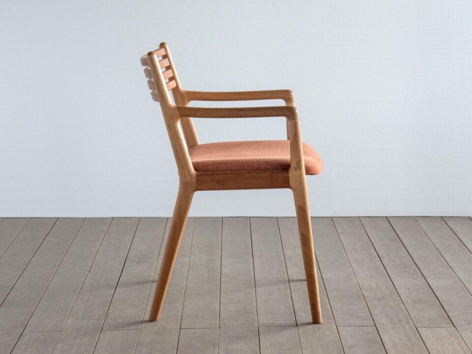 フレームは無垢材を削り出し、木の魅力を活かしながらも、細いフレームにすることで軽快なフォルムのチェアに仕上げられています。背板は緩やかにカーブが施されていて、柔らかく身体を受け止めてくれます。丸みのある断面はずっと触っていたくなるような優しい手触りです。
