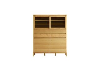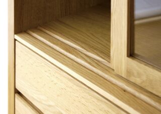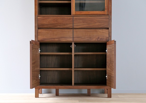 無垢の使用にこだわり、レール部分には金属部品を使用せず、無垢を加工した滑車の溝を施している。開閉は滑らかで「引き出し・扉」とどこを触れても木の温もりを存分に感じられます。キッチンだけでなくリビングにも適した使い勝手の良い収納です。