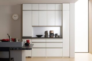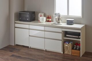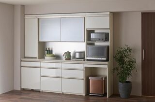 下台・上台と使い勝手がいいように組み合わせていける「NEシリーズ」。充実したアイテムと機能・サイズバリエーションが豊富な点も非常に良い。引き出し等の前板材は傷に強いダイヤモンドハイグロスも仕様しており、オプションでカラーや天然木突板にも変更可能。天板も3種(ダイヤモンドハイグロス天板・人造石天板・天然木突板天板)より選択可能。