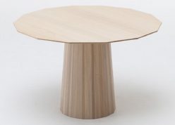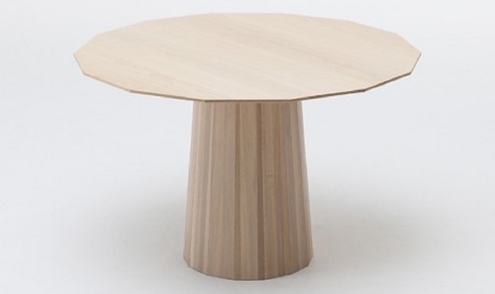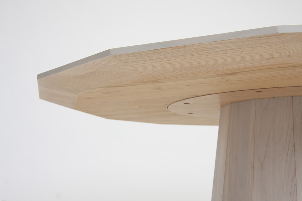 構造としては、伝統的な木工技法「雇い実接ぎ(やといさねつぎ)」を応用し、樽状に木材を組み合わせ特徴的な脚形状をつくり出しています。14角形のテーブルトップは、キノコのように脚が真ん中についており、4~6名が余裕を持って囲めるサイズになっています。