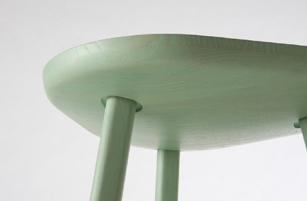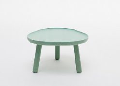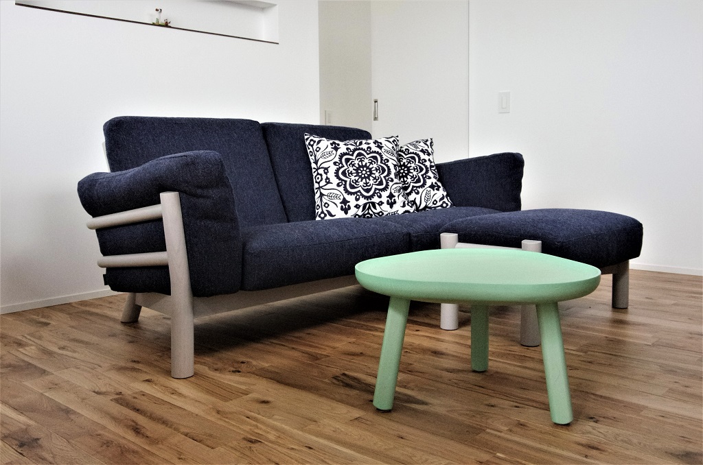 ソファに合わせたSOFT TRIANGLE(ソフトトライアングル)はふちの加工と裏側の丸みが、まるで大木から削り出したかのようです。