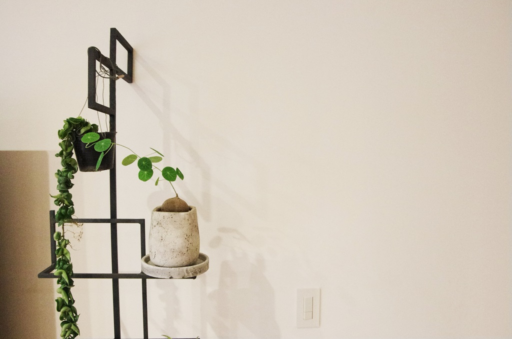 玄関サイドにはクロテツのオブジェスタンドに、さりげなくグリーンをディスプレイ。