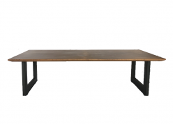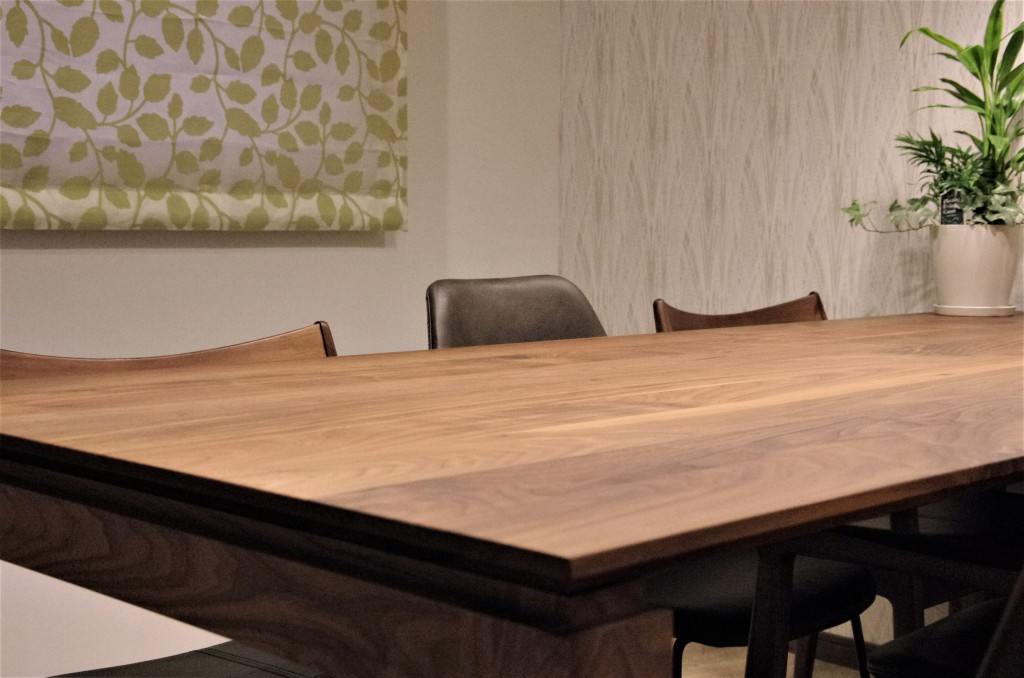 天板が浮いているようなデザインで、無垢の重厚感のある感じを和らげた、モダンテイストのテーブルです。