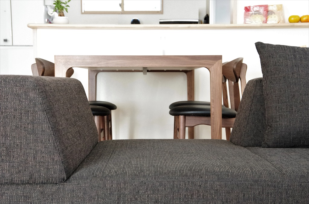 ダイニングとリビングの間にレイアウトすると、ダイニング側を向いて座ってみたり、他のソファにない楽しみ方ができます。