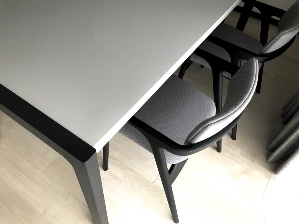 今回は、他のインテリアに合わせ、ライトグレーの天板にホワイトオークのダーク塗装の組合せ。