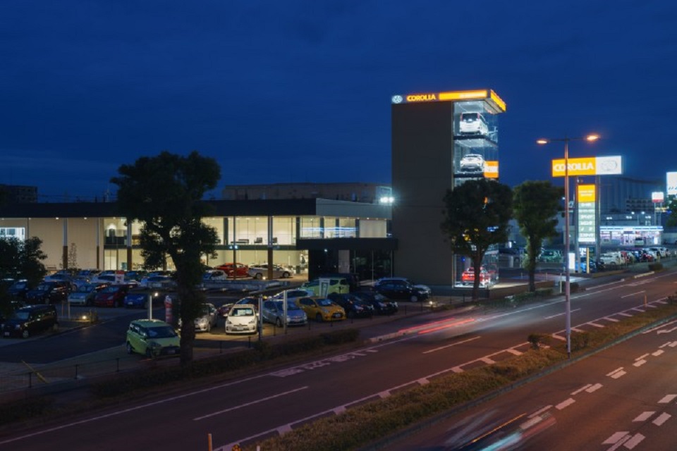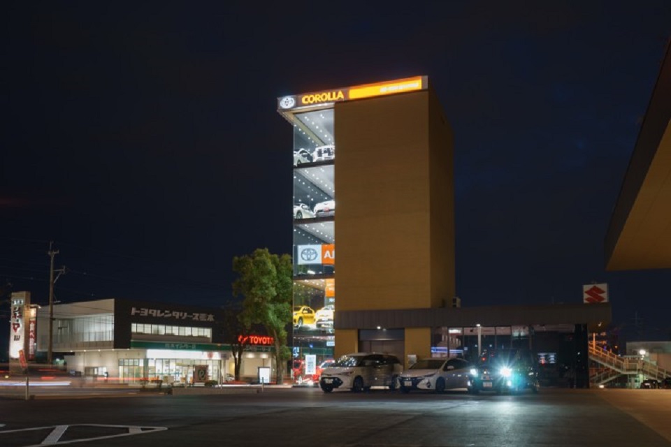 東バイパスに現れた車のディスプレイタワー!夜のライトアップされた姿は圧巻です!!