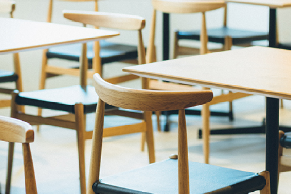 ストレートの丸棒とプライウッドで構成されたFIKAチェア。3パターンの中から客室のイメージに合わせてオーク材のワントーンタイプをお選びいただきました。