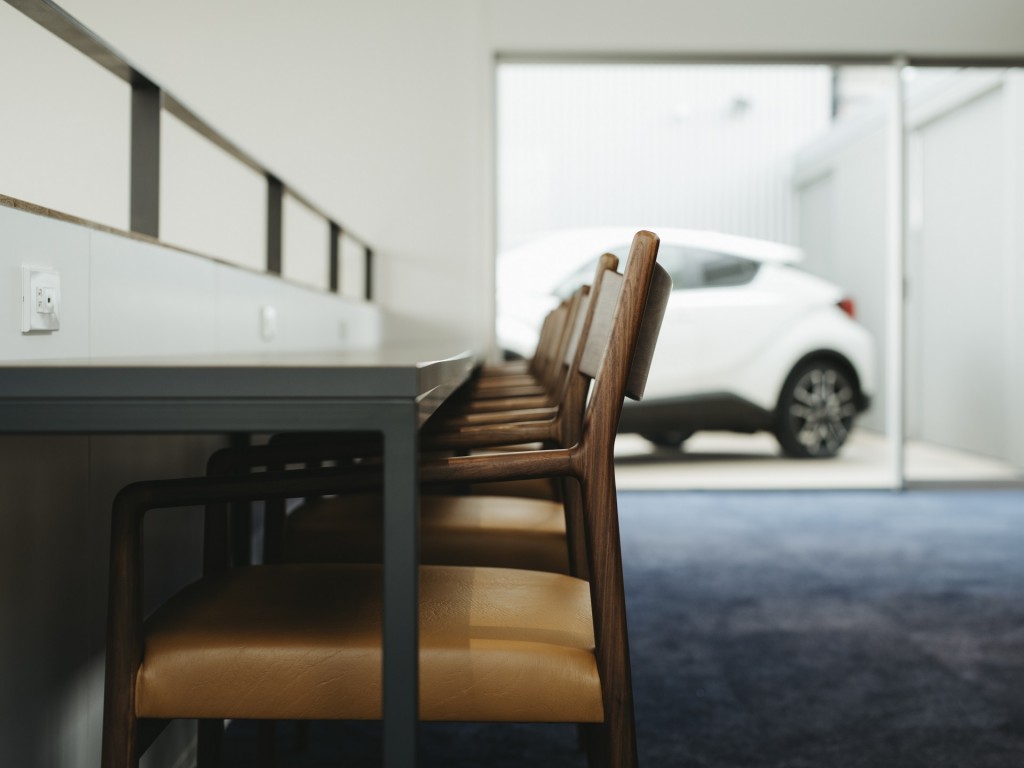 窓側のカウンターテーブルには、繊細なラインのフォルムが魅力的なKAPPEL(カペル)チェア。板座と布座両方お選び頂きました。