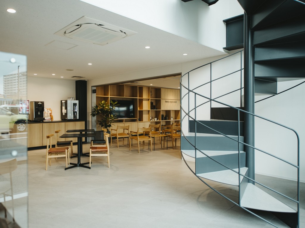 豊肥本線に掛かる陸橋から見える敷地の中に、大きさの違う箱が並べられて作られた、小さな街があるようなイメージのショールーム。2階に展示車を配置する見せ方も目を引きます。