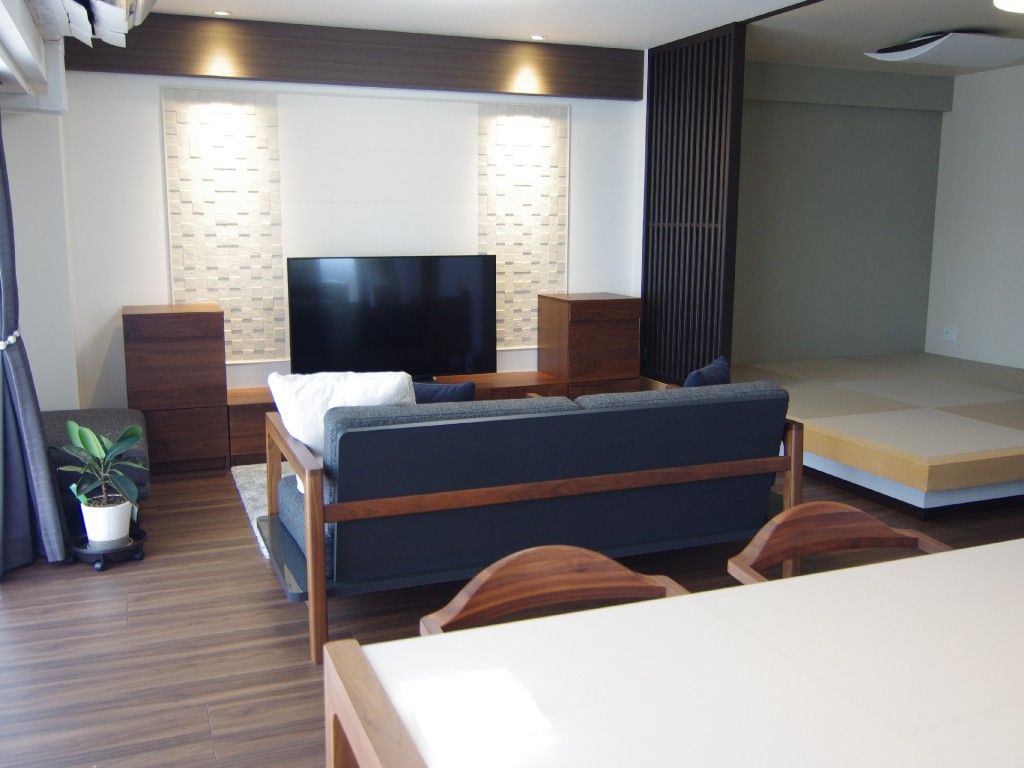 2年前、マンションへのお引越しを機に家具を一新されたS様。お部屋に無駄なものは置かず、シンプルで落ち着いた雰囲気が理想ということで、色々とお話しをお伺いしながら決めていきました。ポイントは収納!!LDKどこを見渡してもキレイに片付いた部屋を目指しました。