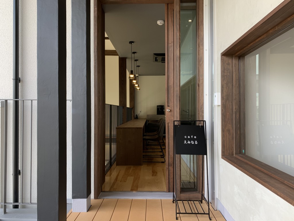 外に出て外階段を登ると、園の中庭が見えます。1階を見下ろしながら上がったがった先にカフェのような空間が広がっています。