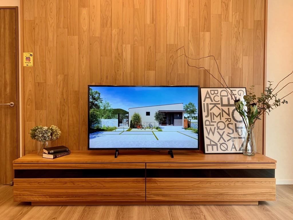 240cmという大型TV用を選ぶにあたり、存在感がありすぎないものにしたいと考えました。ワイドタイプなので左右にディスプレイもできます。センターテーブルはアイウッド様がお持ちのものを合わせています。