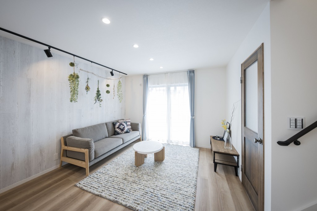 また、壁1面に板材を貼り、他のお部屋とは違う景色が見れるようになっています。板材の壁には、DIYで棚板を取り付けることもでき、家族の思い出などを好きなように飾ることもできます。天井にはスライドレールを設置していますので、スポットライトの位置も自由に動かせ、レールにフックを取り付けて吊り下げるディスプレイも簡単に行えます。暮らしながら手を加えることにより、住まわれるご家族オリジナルのお家に変化していきます。