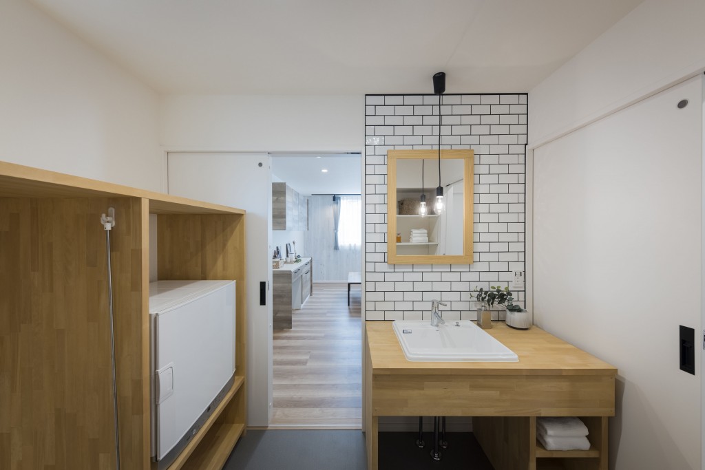 洗面脱衣室は、洗濯乾燥機が設置され、洗濯物の室内干しのスペースとしても設計されており、収納も広くとても使いやすい空間になっていました。ここでも、他のお部屋と違う景色を楽しめるように、造作洗面台をセレクトし、壁1面にアクセントのタイルを貼りました。