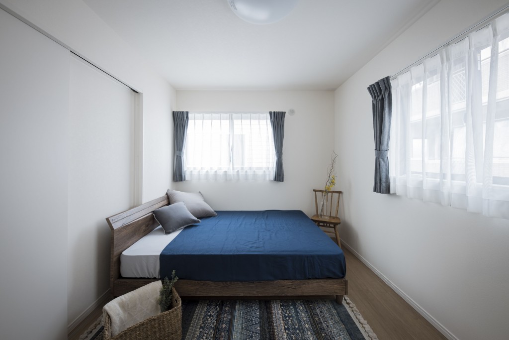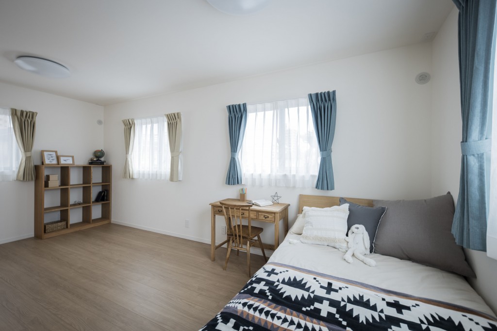 主寝室は、1階の雰囲気と合わせてナチュラルな感じになるようコーディネートしております。ブルー系のファブリックで色を統一して、お家全体で統一感を出しています。