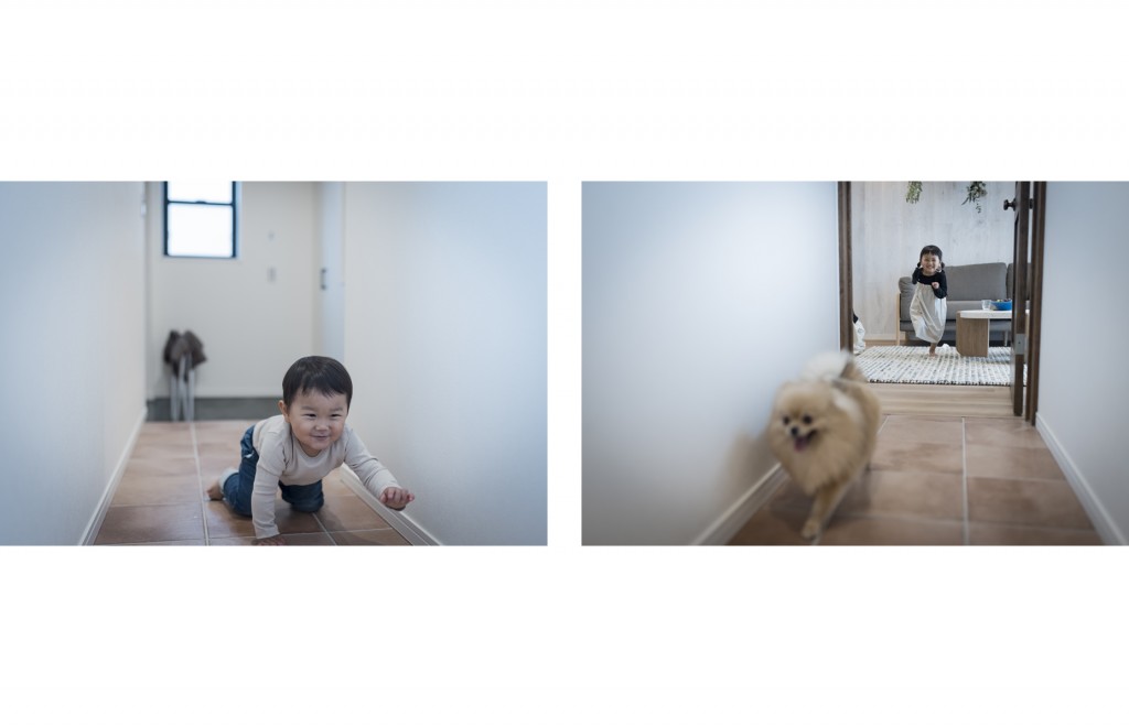 玄関からLDKまで、ペットが自由に動けるような間取りになっていました。それに合わせて、玄関からLDKに続く廊下はタイルを床に貼り、外と中をつなぐ役割をしています。室内ですが、外の雰囲気をタイルで演出しています。