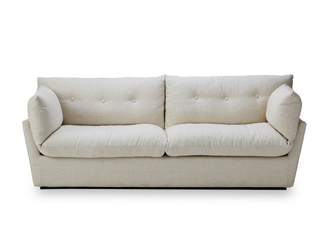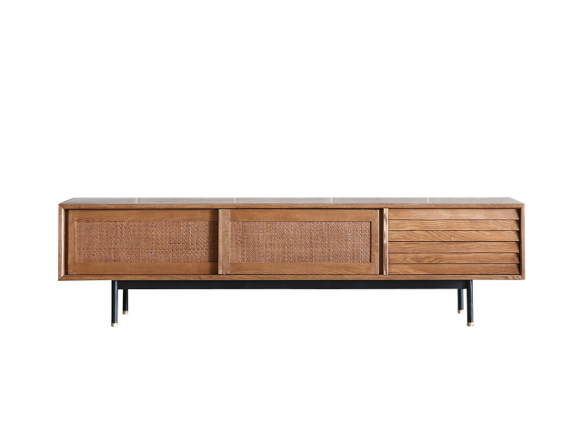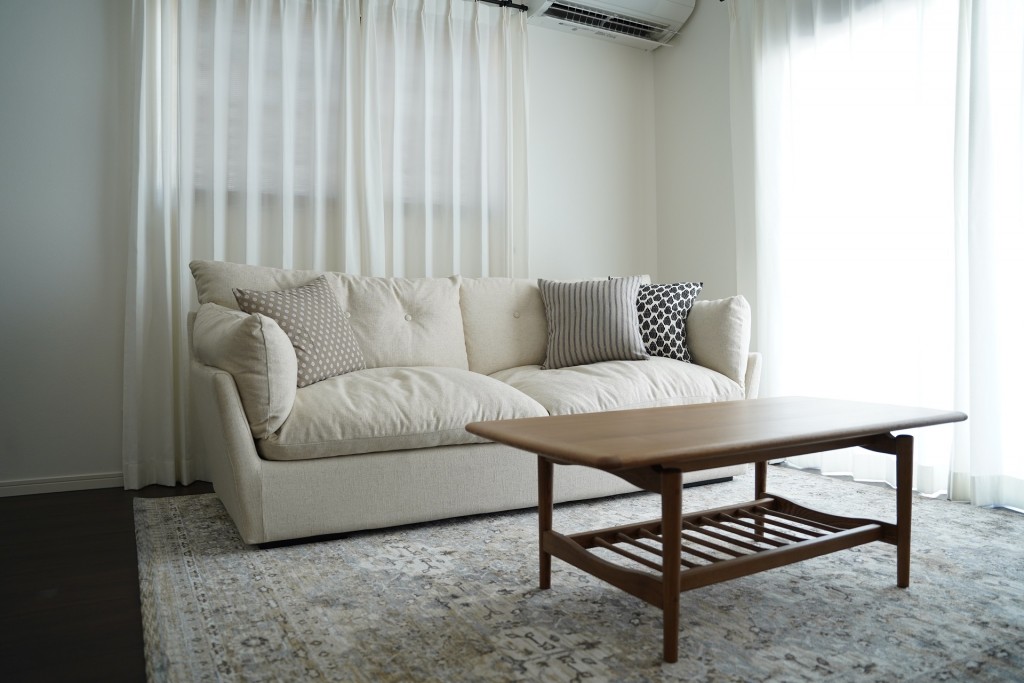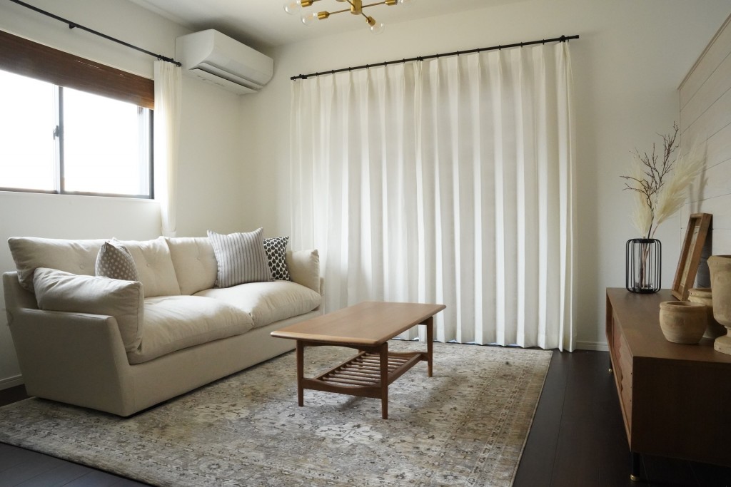 ビンテージ風のPrevell(プレーベル)のリグレーラグに白いソファが映えます。ボリュームのあるNWLH(ノーウェアライクホーム)のジャンソファは見た目のイメージよりもしっかりとした座り心地。NOR(ノル)のホルムセンターテーブルとフィンテレビボードも北欧ビンテージを意識したデザイン。木部はタモ材をチーク材のような色目で塗装したもので揃えました。