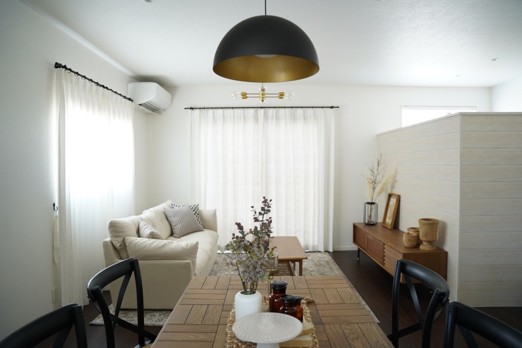 今回の『ドリーム』展示場様、は今までとは少し違う雰囲気だったので、家具も子育て世代を意識してセレクトしました。隣の『アップル』展示場は和の雰囲気漂う内装になっているので、2棟を比べながらご家族で見学するのもいいですね。