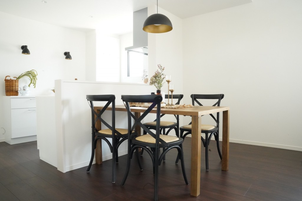 内装はダークブラウンの床にホワイトのクロスで、担当コーディネーターさんより『海外のお家みたいな感じで!』とご要望を頂きました。ベースカラーはホワイト、アソートカラーはブラウン、アクセントカラーはブラックの無彩色の落ち着いた雰囲気でまとめました。
