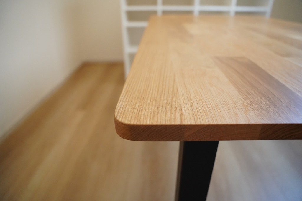 今回は、お客様がテーブルの角に当たらないようにというコーディネーターさんの配慮から、天板にR加工(丸く)をしました。