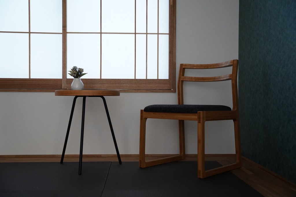 テーブルのトレイ部分は取り外しができる白と黒のリバーシブル仕様なので、お部屋の雰囲気に合わせて使い分けができます。畳摺(たたみずり)の椅子は座面高380mmで、和室の空間でも馴染む高さです。