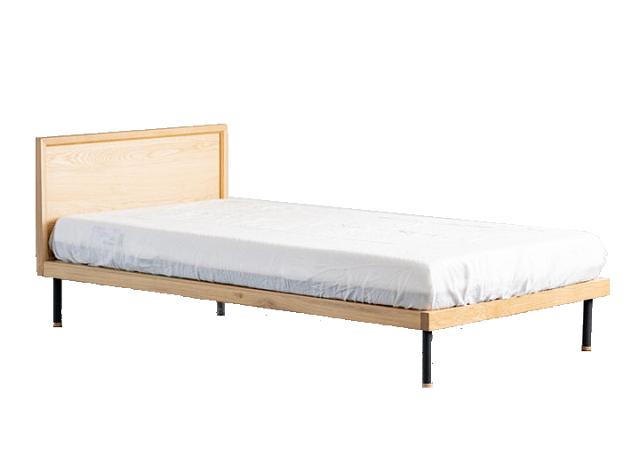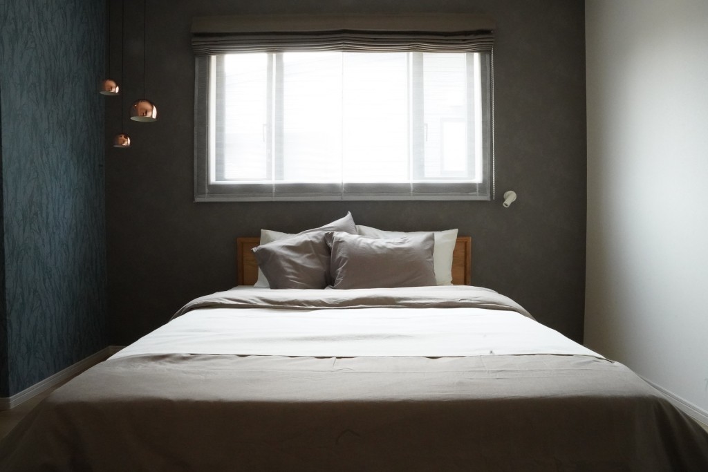 落ち着いた雰囲気の寝室にはNWLH(ノーウェアライクホーム)のUNIK FLAT(ユニックフラット)ベットフレーム。厚みを抑えたヘッドボードと、スッと伸びた細身のスチール脚がスタイリッシュな印象です(画像に脚元は写っておりませんが、、)