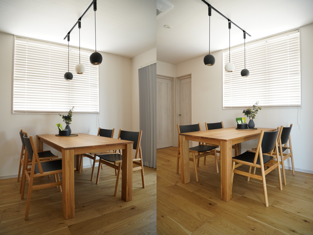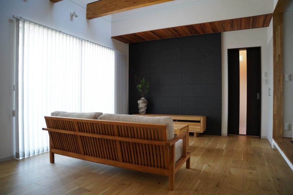 玄関・和室・キッチン・ウッドデッキにつながるリビングなので、どこから見ても邪魔にならないように木部はオーク材で統一。