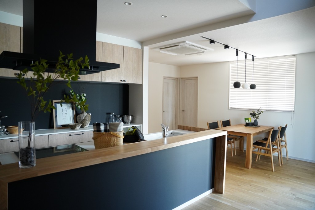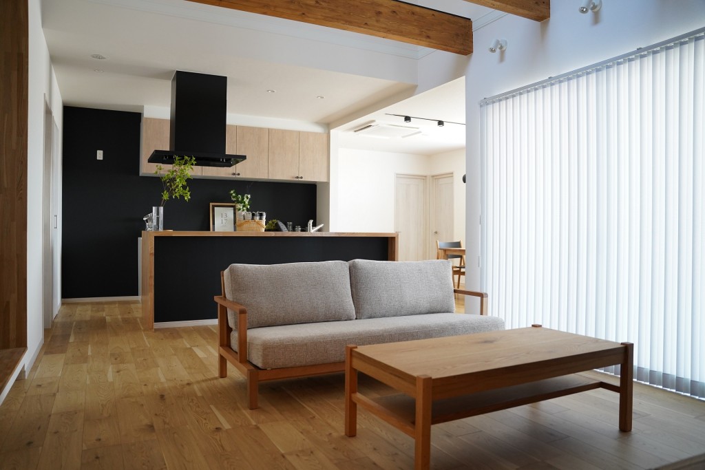 リビングの横に印象的な和室があり、全体の内装はナチュラルウッドの床と白い壁がベース。キッチンはナチュラルウッドと黒がメインのカラーになっています。