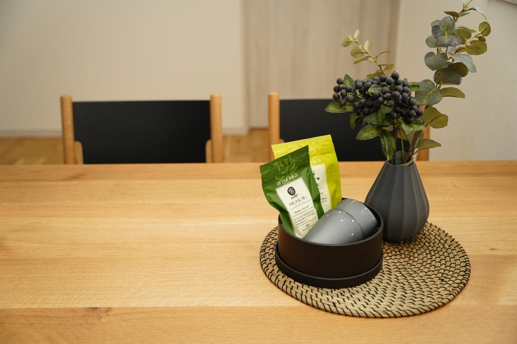 ダークグリーンのアクセントクロスにダークグレーの琉球畳と障子を合わせた印象的な内装。竹製家具専門ブランドTEORI(テオリ)の和室チェアとエントレイテーブルで、普段と違うスタイリングにしてパッと目を惹くようにしました。