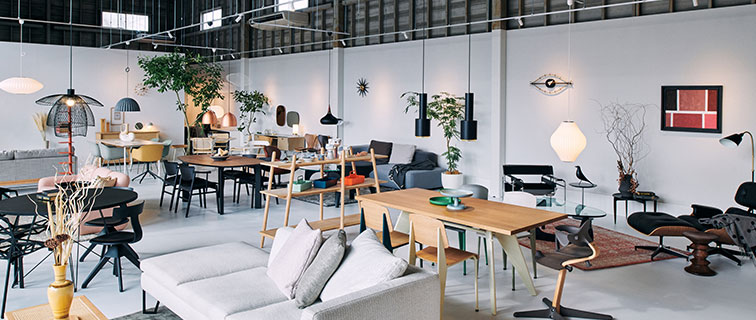 白とベージュを基調とした内装に、個性豊かな家具を配置し、北欧モダンな空間にコーディネートしてます。