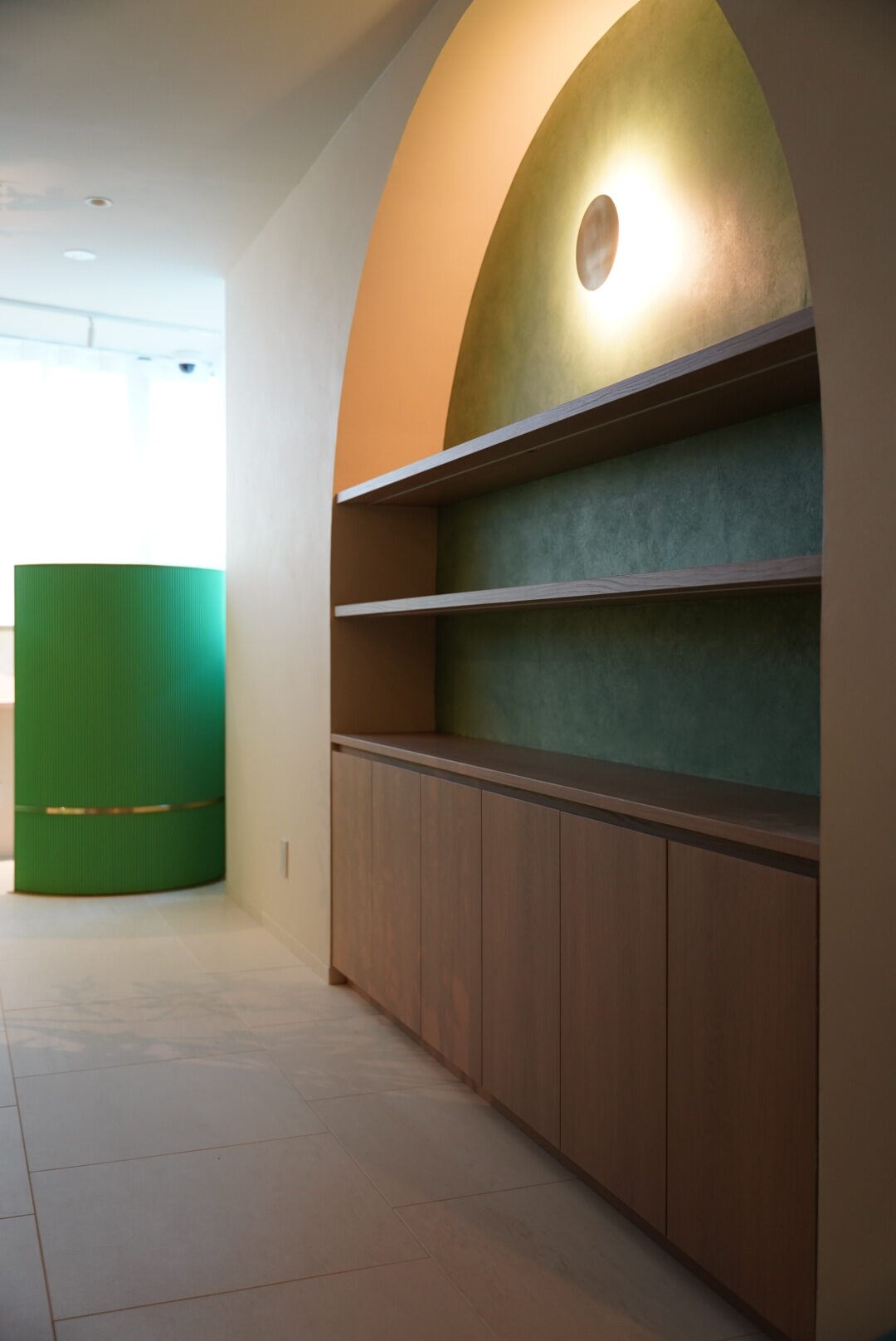 グリーンの壁は、色の濃淡を表現する際に適しているフレンチウォッシュで仕上げ、その他の部分は、